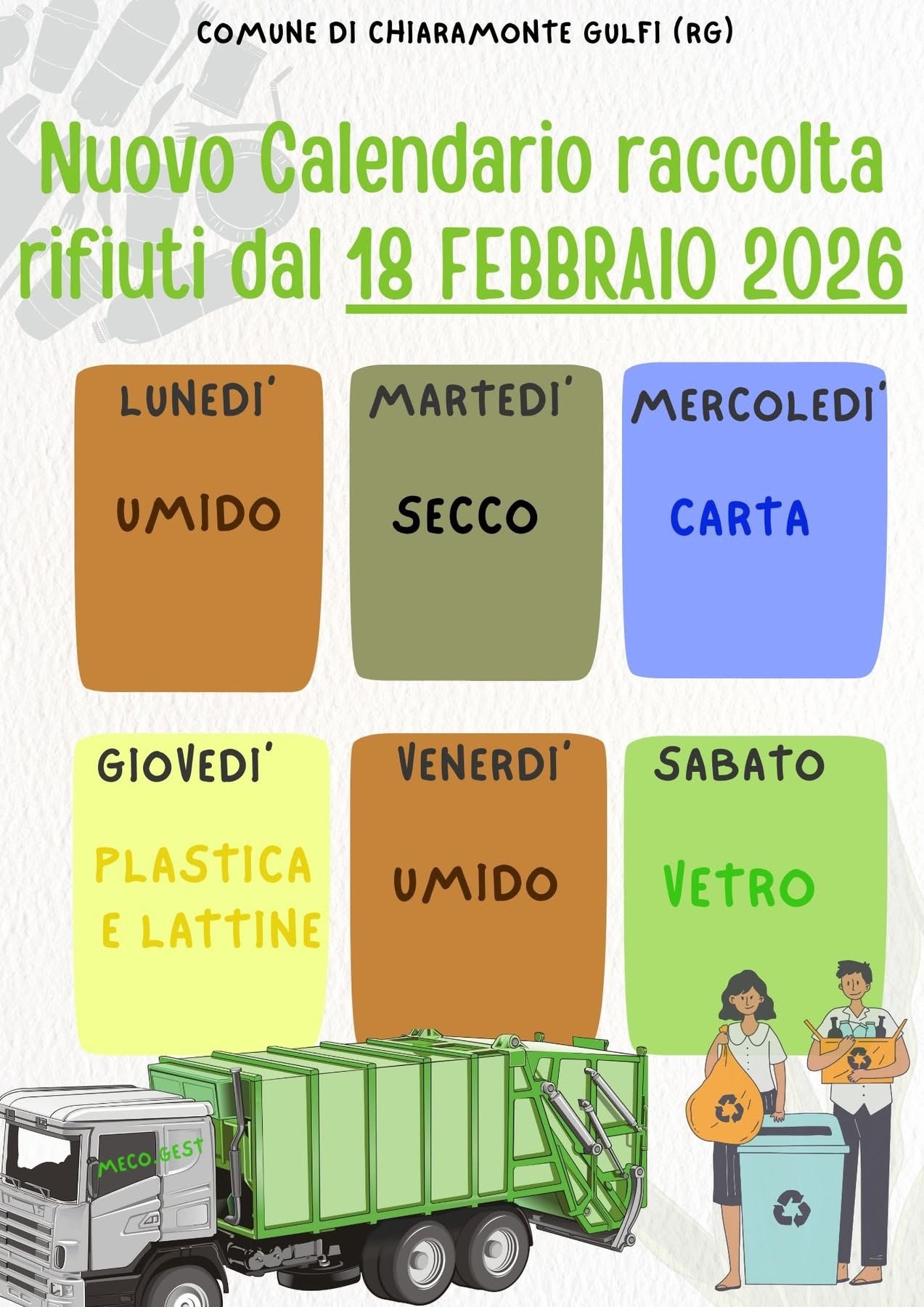 A partire dal prossimo 18 Febbraio 2026 la raccolta differenziata avverrà secondo il calendario allegato